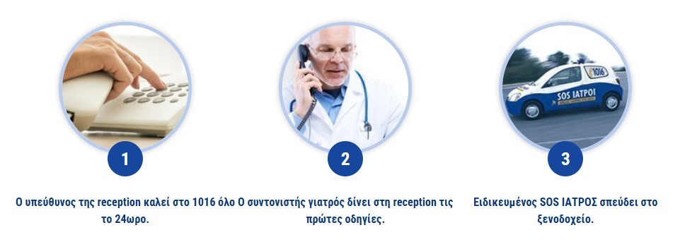 Η οργάνωση SOS ΙΑΤΡΟΙ εξασφαλίζει την άμεση μετάβαση ειδικευμένου ιατρού στο χώρο του ξενοδοχείου οποιαδήποτε μέρα και ώρα. Η διαδικασία είναι απλή: