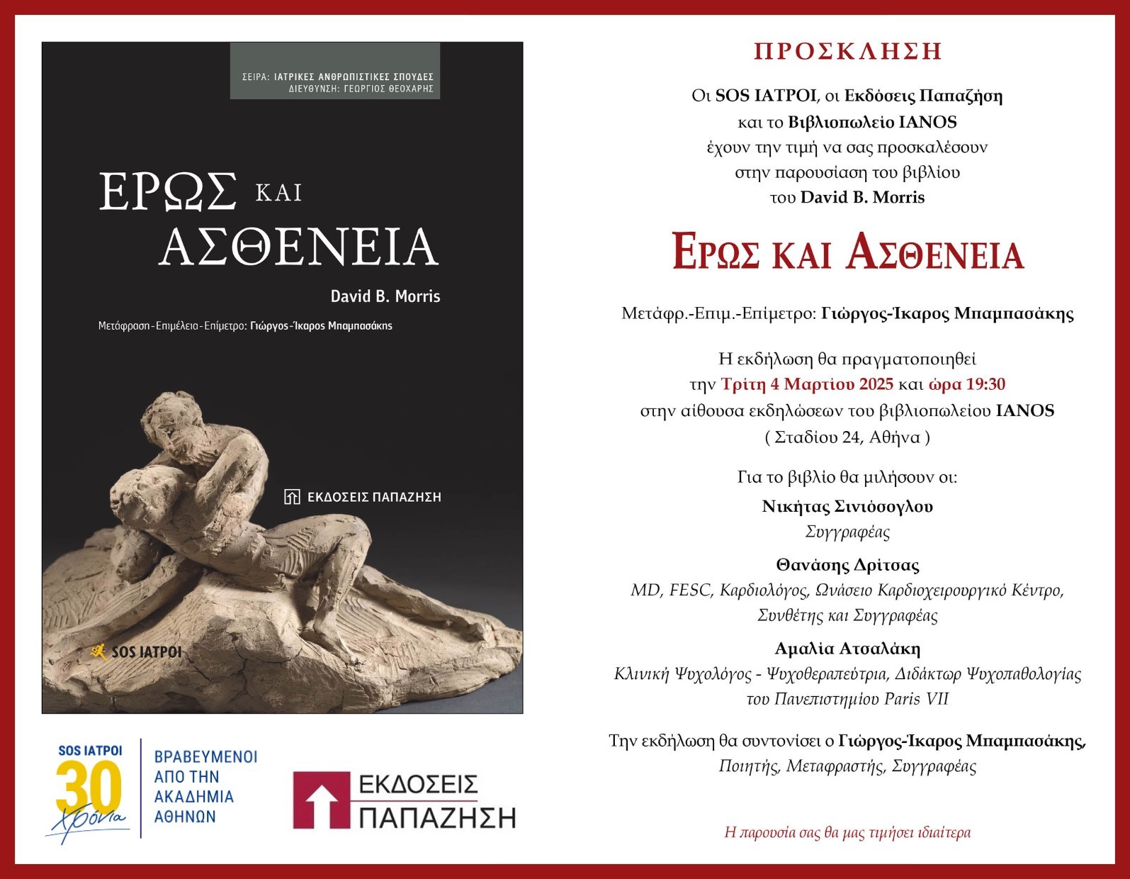 ΠΡΟΣΚΛΗΣΗ Οι SOS ΙΑΤΡΟΙ, oι Εκδόσεις Παπαζήση και το Βιβλιοπωλείο IANOS έχουν την τιμή να σας προσκαλέσουν στην παρουσίαση του βιβλίου του David B. Morris Έρως και Ασθένεια Η εκδήλωση θα πραγματοποιηθεί την Τρίτη 4 Μαρτίου 2025 και ώρα 19:30...