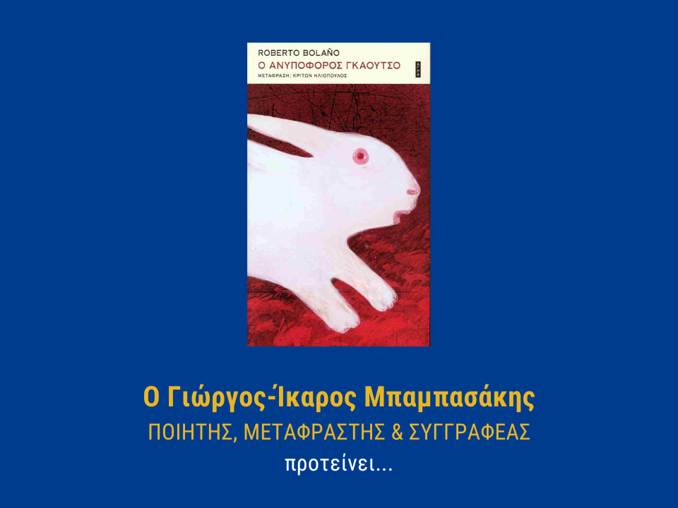 Καλό φθινόπωρο, φίλες και φίλοι της Αφηγηματικής Ιατρικής. Επισημαίνω την έκδοση του εκπληκτικού βιβλίου του Ρομπέρτο Μπολάνιο (Roberto Bolaño, 28 Απριλίου 1953 – 15 Ιουλίου 2003) Ο Ανυπόφορος Γκάουτσο (μτφρ. Κρίτων Ηλιόπουλος, εκδ. Άγρα) όπου στεγάζεται το πολυσυζητημένο δοκίμιο «Λογοτεχνία...