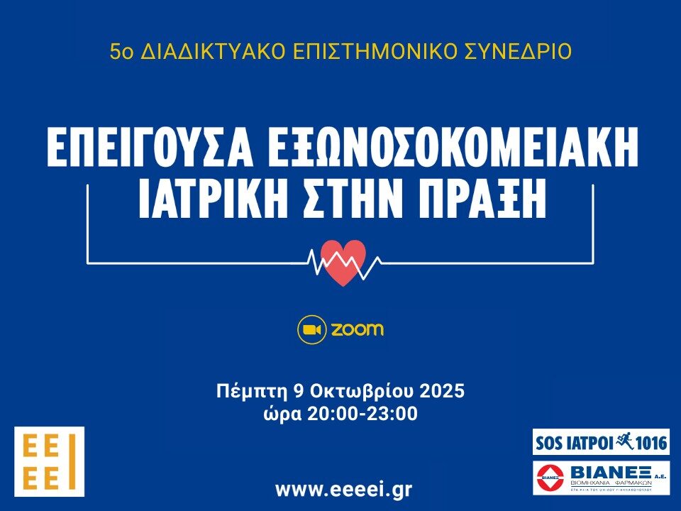 Εκ μέρους της Ελληνικής Εταιρείας Εξωνοσοκομειακής Επείγουσας Ιατρικής (ΕΕΕΕΙ) και της SOS ΙΑΤΡΟΙ, θα θέλαμε να ενημερώσουμε για τη διενέργεια του 5ου Διαδικτυακού Επιστημονικού Συνεδρίου, την Πέμπτη, 9 Οκτωβρίου 2025, και ώρα 20:00–23:00, στο πλαίσιο της από κοινού εκπαιδευτικής δραστηριότητας, η οποία στοχεύει στη συνεχιζόμενη εκπαίδευση με στόχο την ορθότερη άσκηση της Επείγουσας Εξωνοσοκομειακής Ιατρικής στην Ελλάδα.