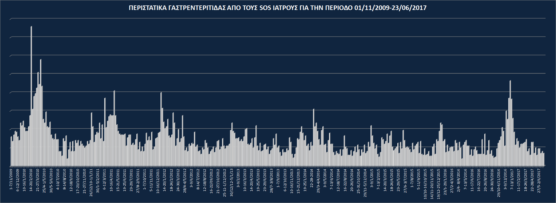 28 Αυγούστου 2015 SOS ΠΑΡΑΤΗΡΗΤΗΡΙΟ ΓΙΑ ΤΙΣ ΛΟΙΜΩΞΕΙΣ ΓΑΣΤΡΕΝΤΕΡΙΚΟΥ Οι SOS ΙΑΤΡΟΙ καταγράφουν σε καθημερινή βάση την εξέλιξη των περιστατικών γαστρεντερίτιδας για τους μήνες Νοέμβριο 2009 έως και 23 Ιουνίου 2017. ΠΙΣΩ Βράβευση από την Ακαδημία Αθηνών Πιστοποιημένοι από τον Ιατρικό Σύλλογο Αθηνών Silver Award Mobile Excellence Awards 2022 Silver Award Healthcare Business Awards 2022 Πιστοποίηση ISO