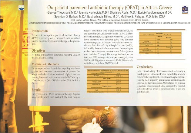 Το ενδιαφέρον για την ενδοφλέβια Αντιβιοτική Παρεντερική Αντιβιοτική Θεραπεία (ΕΠΑΘ) αυξάνεται, καθώς θεωρείται μια σημαντική συμπληρωματική ή εναλλακτική στρατηγική έναντι της εισαγωγής σε νοσοκομείο. Εξετάσθηκαν 90 ηλικιωμένοι ασθενείς (μέσος όρος ηλικίας 85 ετών) με σοβαρές λοιμώξεις αλλά και άλλα μείζονα ιατρικά προβλήματα (κλινήρεις ασθενείς, ανοϊκοί, με ιστορικό αγγειακών εγκεφαλικών επεισοδίων, κακοηθειών).Οι ασθενείς αυτοί (πολλοί εκ των οποίων τελικοί) ή οι οικείοι τους επέλεξαν την κατ’ οίκον νοσηλεία, αρνούμενοι την εισαγωγή τους σε νοσοκομείο.Το 62% και πλέον αυτών θεραπεύτηκε αποτελεσματικά με χορήγηση ενδοφλέβιας αντιβιοτικής αγωγής στο σπίτι.(δείτε την παρουσίαση του συνεδρίου).