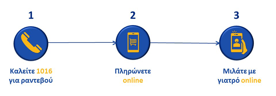 1. Καλείτε 1016 (με αστική χρέωση από σταθερό ή κινητό από όλη την Ελλάδα) και μιλήστε δωρεάν με συντονιστή ιατρό μέρα και νύχτα. Κλείστε ραντεβού με ειδικευμένο ιατρό την ημέρα και ώρα που επιθυμείτε.